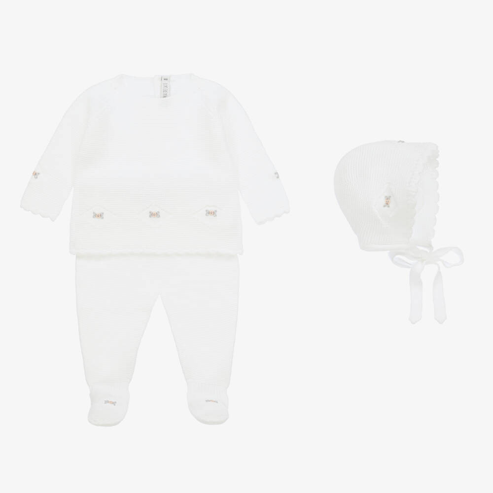 Adorable white knitted two-piece babygrow and bonnet set for girls by Paloma de la O. Beautifully soft, the set is made in a wool blend knit and each piece is trimmed with grey and pink embroidered flowers, with scalloped edging on the top and bonnet. The top fastens with buttons on the back, the bonnet secures with ties under the chin, and the bottoms have a gently elasticated waist for comfort.