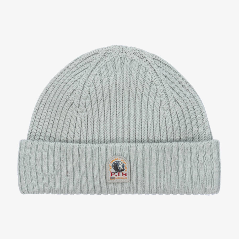 Mini-me pale green hat for boys and girls from Parajumpers, made in a blend of the softest Merino wool. Ideal for those colder days, it is made In a cosy ribbed knit, with a turned-up brim featuring the brand's logo patch, for a distinctive designer finish.