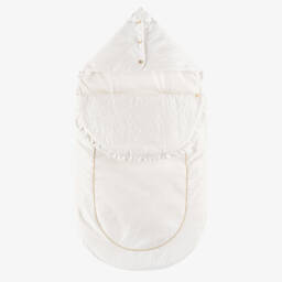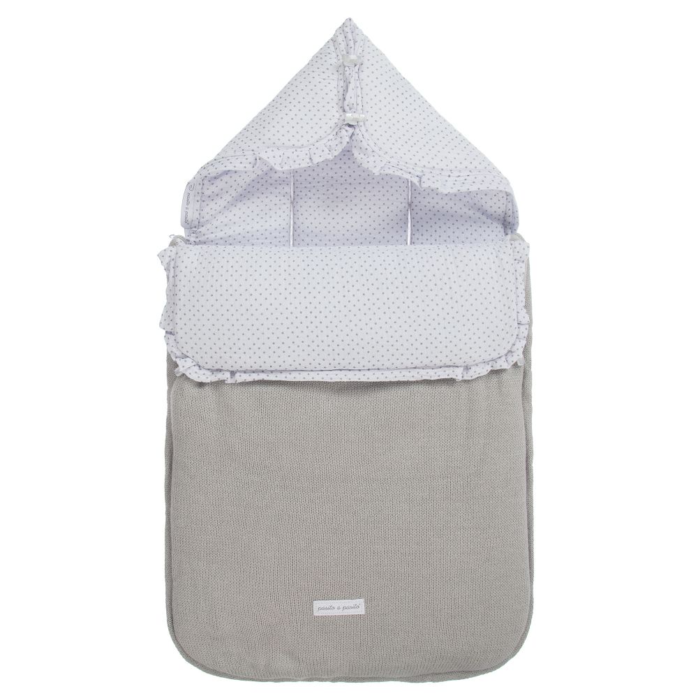 A useful and charming 3-in-1 baby nest for baby girls and boys by Pasito a Pasito, with slits for straps on the back so that it may be used in the nursery, car seat and pram or stroller. It has a soft cotton jersey side with grey star print on a blue background and a soft, grey knitted side. Padded for warmth, it has a toggle fastening hood for extra cosiness. There is a zip fastening along the sides and bottom for easy access.