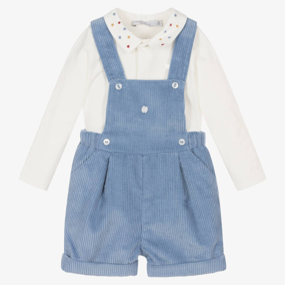 Cute ivory bodysuit and blue shorts set for baby boys by Patachou. The bodysuit is made in soft, brushed cotton jersey with popper fastenings on the front and between the legs for easy dressing. Warm and cosy, it has a sweet cotton collar embroidered with colourful stars and a little logo charm on the chest. The dungaree-style shorts are made in soft cotton corduroy, with a lightweight cotton lining for comfort. They have adjustable, button-fastening shoulders straps, an elasticated waist and button and logo trims on the front.