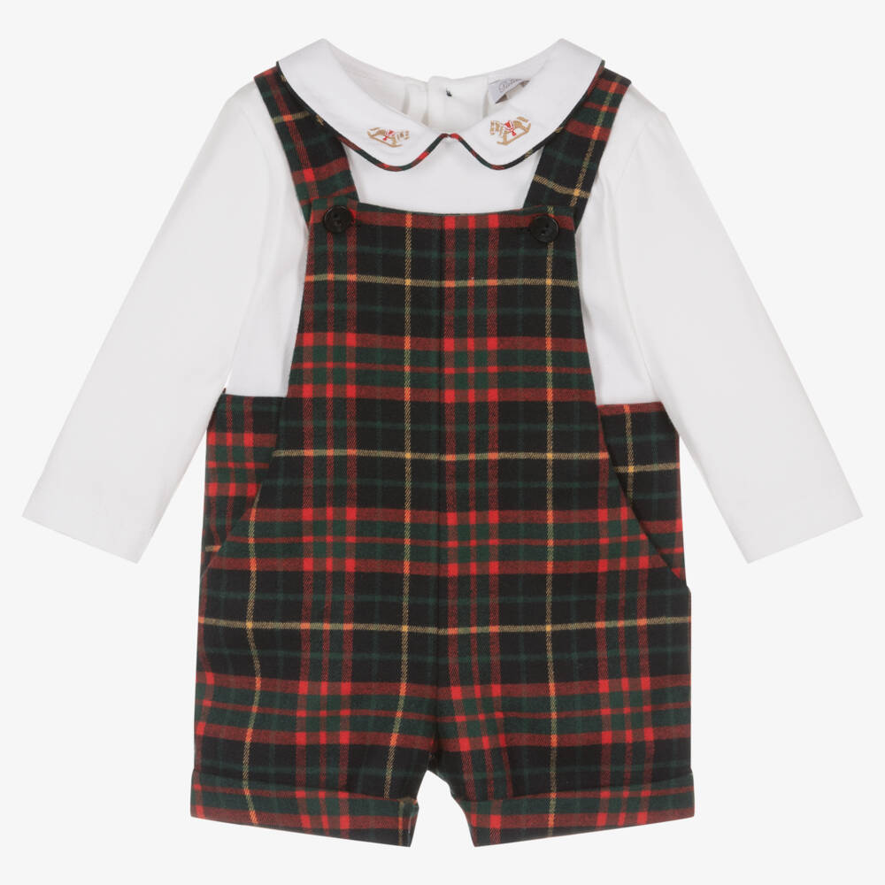 Sweet red and green tartan shortie for baby boys by classic Portuguese brand Patachou. With the look of a two piece set, it has a white 'shirt' in soft brushed cotton, with cute embroidered rocking horses and a tartan trim on the collar. The soft, brushed 'dungarees' fasten with buttons on the adjustable straps on the front, and around the back. Fully lined, they have fixed turn-ups and useful popper fastenings between the legs.