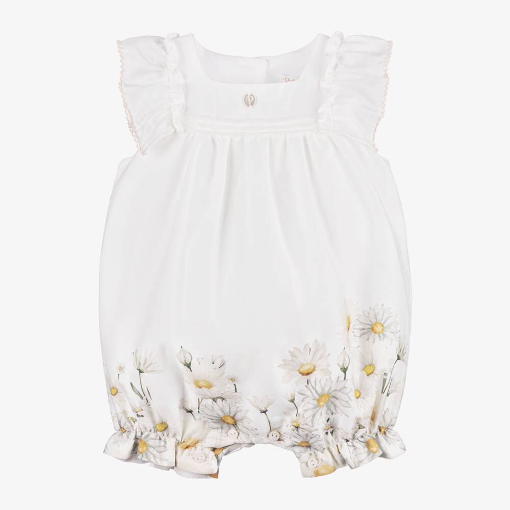 White cotton shortie for baby girls by Patachou, with a beautiful daisy flower pattern. It has pintuck detailing on the chest and pretty ruffles over the shoulders, trimmed with delicate picot embroidery This lovely babysuit is fully lined for comfort and fastens with buttons on the back and between the legs. A branded pearlescent charm adds a subtle designer finish.