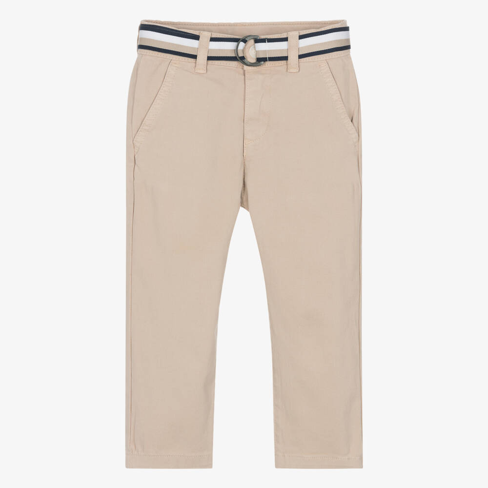 Smart-casual beige chino trousers for boys by Patachou, made in stretchy cotton twill. A classic style, they have slanted front pockets and a single welt pocket on the back, with a tonal embroidered logo above. They fasten with a zip and button and have an adjustable waistband for a comfortable fit. A striped canvas D-ring belt in navy blue, beige and white adds a stylish finish.