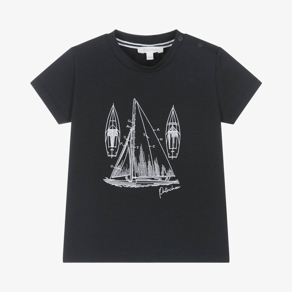 Casual navy blue T-shirt for boys by Patachou, with white sailboat embroidery on the front. This nautical top is made in soft and comfortable cotton jersey, with shoulder poppers to help with dressing.