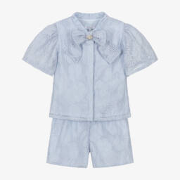 Cool blue shorts set for boys by Patachou. Made in soft and comfortable cotton blend terry towelling, it is great for every day and poolside casual. The polo shirt has an open V-neck with white striped trims and a slightly longer back hem. The pull-on shorts have a drawstring waist and two pockets.