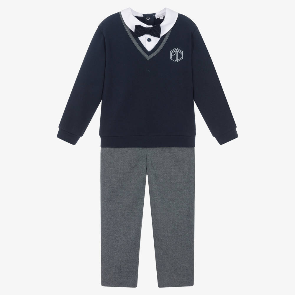 A smart navy blue and grey trouser set for boys by Patachou. Made from soft cotton jersey with a fleecy inside, the V-neck sweatshirt has a contrasting white collared shirt insert on the neckline with black button fastenings and a detachable pinstripe bowtie. There is an embroidered grey logo on the chest and practical popper fastenings on the back for easy dressing. Fully lined in soft cotton, the cosy brushed trousers have handy slanted pockets on the front and a small pocket on the back. They fasten with a zip and button and have an adjustable waistband for a great fit.
