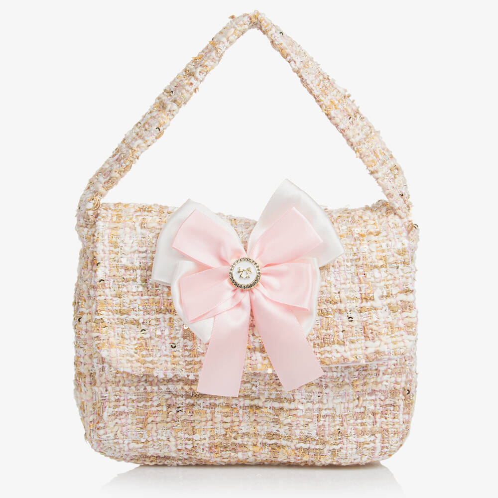 Exclusive to Childrensalon, a special occasion beige handbag for girls by Patachou. Made in softly textured tweed, it has a pretty white and pink bow on the front, with a sparkly diamanté logo. There is a pale pink cotton lining and a popper fastening flap to secure. An elegant design, it is sure to add a touch of sophistication to her outfit.