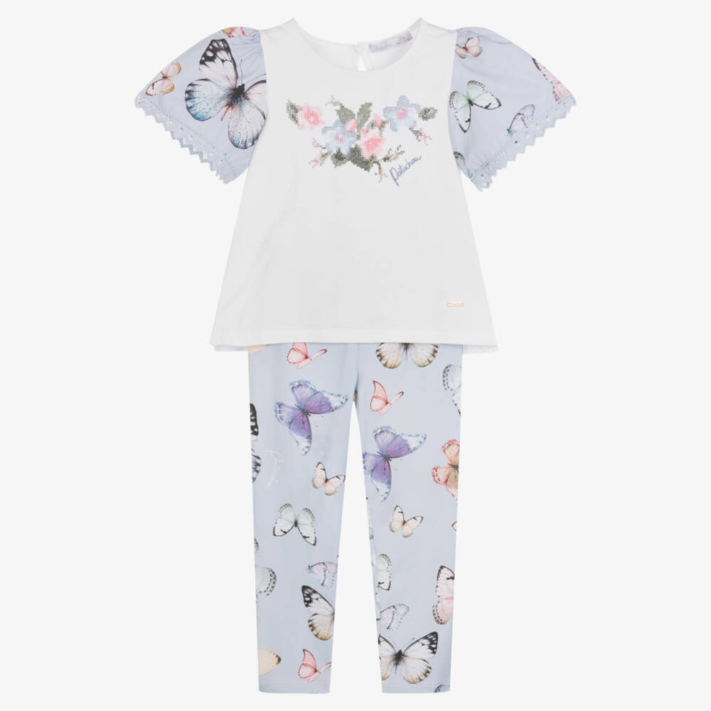 Exclusive to Childrensalon, a pretty white and blue leggings set for girls by Patachou. With a lovely cross stitch flower design on the front, the T-shirt has a white jersey body with split side vents and a rose gold logo tab sewn above the hem. The light blue poplin sleeves gently gather on the shoulder for a feminine look. With pretty blue cotton lace trims, the sleeves are patterned in a contrast butterflies print which is made to match the stretchy, full-length leggings.