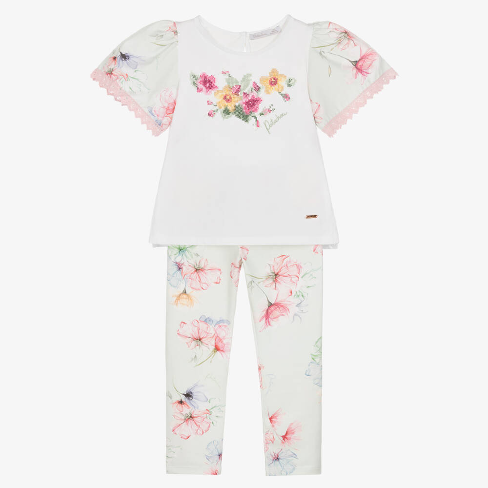Exclusive to Childrensalon, a pretty white and mint green leggings set for girls by Patachou. With a lovely cross stitch flower design on the front, the T-shirt has a white jersey body with split side vents and a rose gold logo tab sewn above the hem. The green poplin sleeves gently gather on the shoulder for a feminine look. With pretty pink cotton lace trims, the sleeves are patterned in a contrast floral print which is made to match the stretchy, full length leggings.