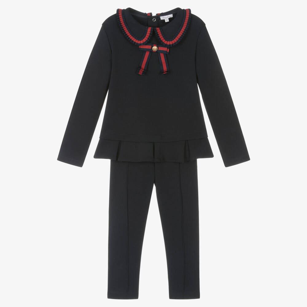 Navy blue top and trouser set for girls by Patachou. Made in soft, mid-weight cotton jersey, the set does not compromise style for comfort. The pleated-hem top has a round collar with red pleated grosgrain ribbon trims, a decorative bow and golden button on the front. Tonal poppers fasten on the back for neatness and simple dressing. The slim-fitting trousers have an elasticated waistband and smart seam detail on the front.