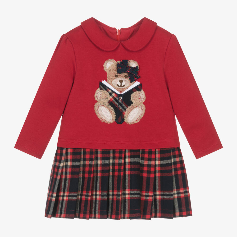 An adorable red long-sleeved dress for girls by Patachou, made from soft cotton jersey with a lightweight partial lining. It has a cute beige embroidered and appliqué teddy bear reading a book design on the chest, trimmed with a pretty grosgrain ribbon bow. Fastening neatly with a concealed zip on the back, it has a soft brushed twill skirt with a lovely red and navy blue tartan pattern, and a sweet Peter Pan collar for a classic finish.