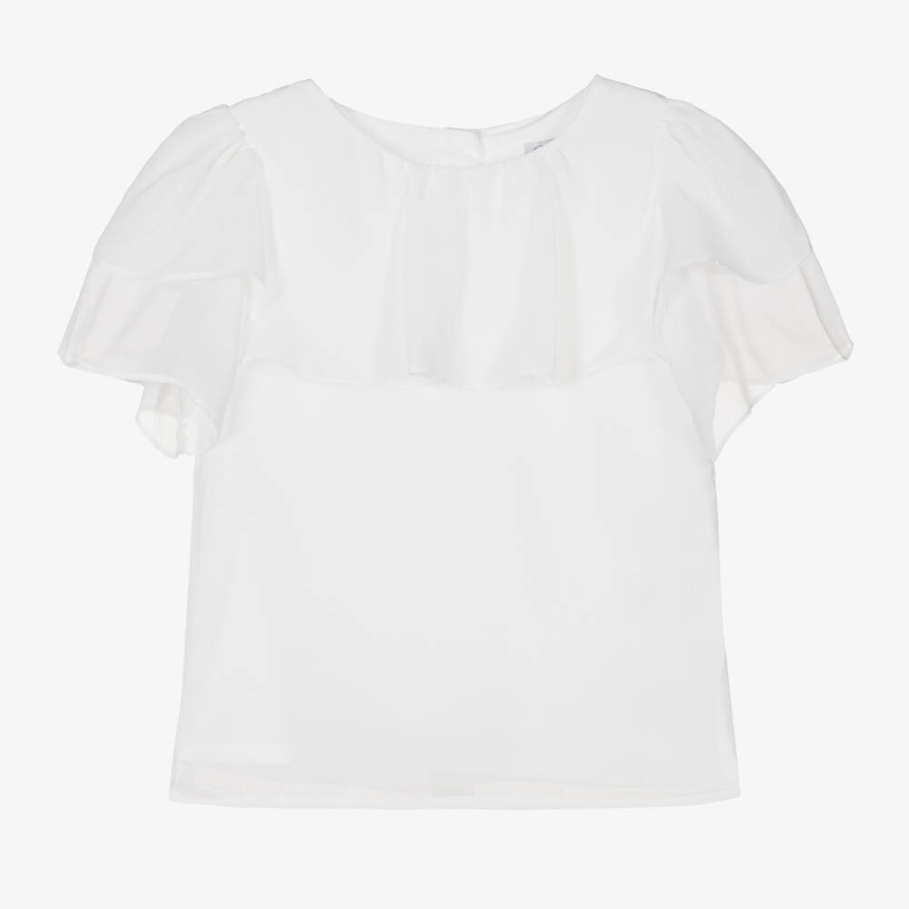 Exclusive to Childrensalon, this white blouse for girls is designed by Patachou. Floaty and elegant, it is made in luxuriously soft chiffon and has a lightweight cotton lining for comfort. The tiered sleeves and ruffle neckline add a feminine touch to this look. The style is finished with button fastenings on the back.