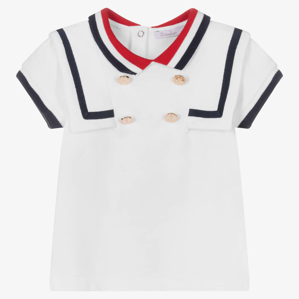 White cotton polo shirt for girls by Portuguese brand Patachou, made in comfortable piqué with navy blue and red striped trims. Traditionally styled but with a modern twist, this top has a square sailor-style shoulder trim with decorative gold buttons with anchor detailing for a nautical-inspired look. There are easy fasting poppers on the back.