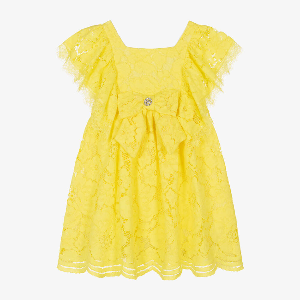 Eye-catching bright yellow dress for girls by classic Portuguese brand Patachou, exclusive to Childrensalon and just right for a special occasion. Made in lightweight chiffon with a cotton lace overlay, it has wonderful ruffles on the sides of the bodice and over the shoulders, with scalloped, eyelash trims. There is a large, fixed bow on the front, with a central, sparkling diamanté button. The dress has a full, gathered skirt, is lined in voile for comfort and fastens with a discreet, concealed zip on the back.