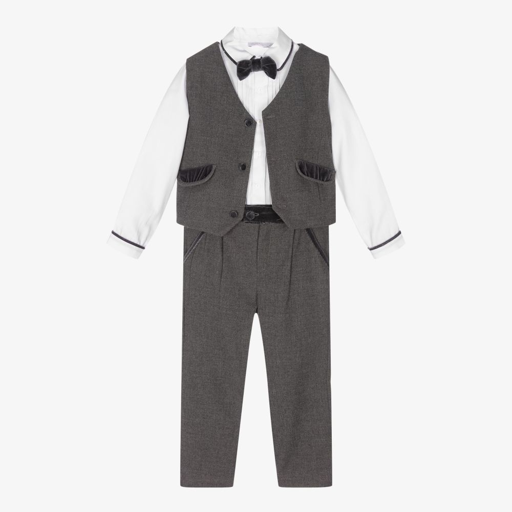 Boys grey and white three-piece waistcoat suit from Patachou. The trousers and waistcoat are both made in a brushed viscose blend, with grey velvet trims. The waistcoat has a silky-soft lining and fastens with velvet buttons on the front. The trousers are lined in lightweight cotton, with an adjustable waistband and a zip and buttons to fasten. The cotton twill shirt has pintuck pleating on the chest and comes with a button-on grey velvet bow tie.