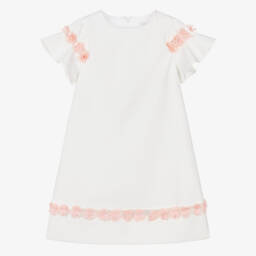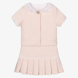 Exclusive to Childrensalon, a light pink special occasion top and skirt set for girls by Patachou. The top has a beautiful floral lace overlay, a square neckline and fixed grosgrain ribbon bow trims on the shoulders. It is lined in cotton voile and fastens with single button fastenings on the back. The tulle skirt is lined in cotton voile and fastens with a zip on the back.