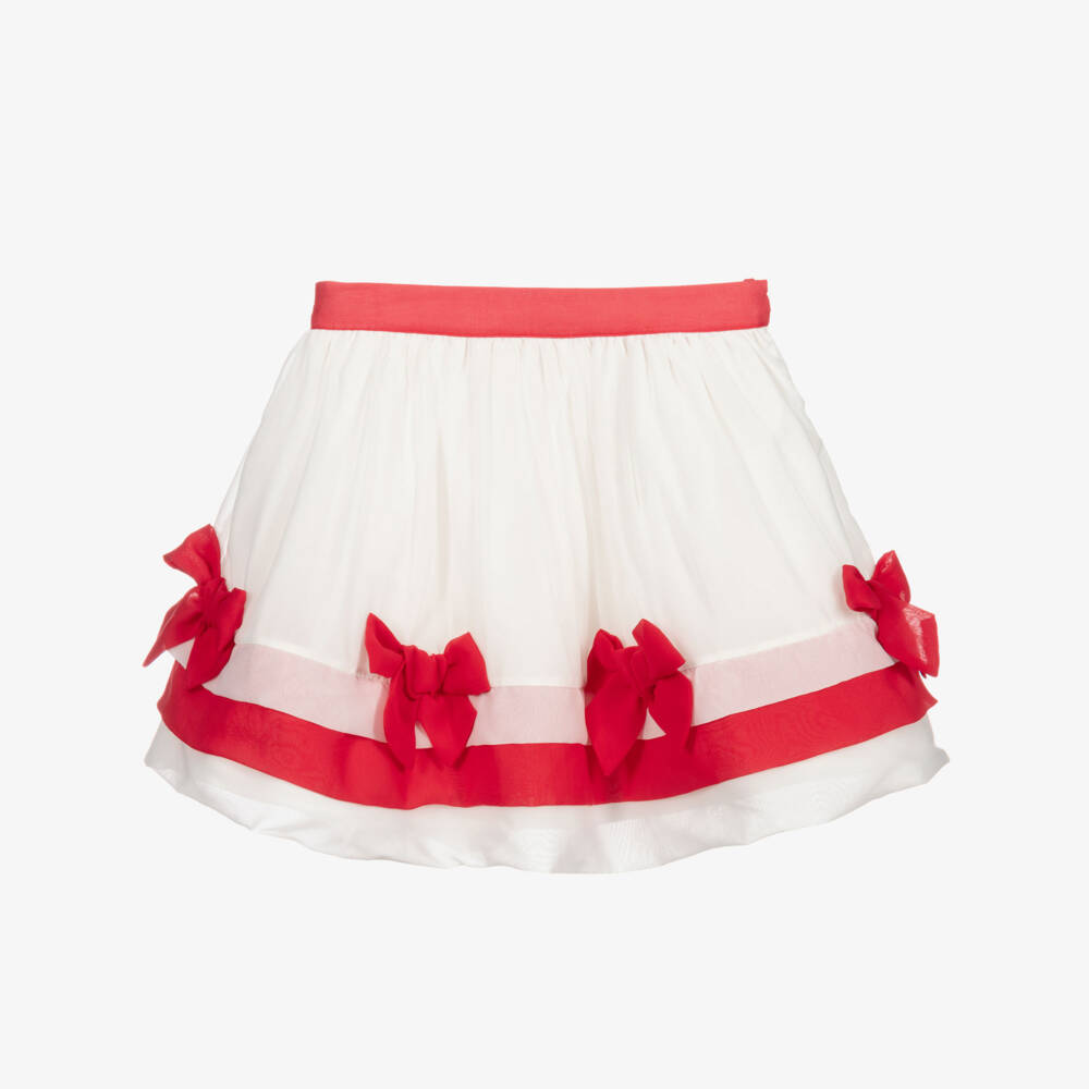 White skirt for girls by Patachou, made in soft, lightweight chiffon, with red trims and bows. It has a double cotton lining, with soft tulle for added volume. It fastens with a button and zip on the side and has a useful adjustable waist.