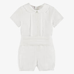 Classically styled ivory and green shorts set for baby boys by Paz Rodríguez. Made in a cotton and linen blend, the lightweight shirt is detailed with delicate green embroidery. The coordinating shorts have a gently elasticated waistband and a lightweight voile lining. Both pieces secure together with mother-of-pearl logo buttons for a neat, tucked-in look.