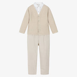 A sweet pink trouser set for baby girls by Paz Rodríguez, including a softly textured knit cardigan. The lovely layering piece has a scalloped hem and two mother-of-pearl buttons on the neckline. Buttoned on the back, the ivory blouse has elasticated cuffs and a pretty embroidered collar for a layered look. Lined with lightweight fabric, the cotton trousers have a distinctive basket weave finish with decorative buttons on the waistband. The fit can be easily adjusted for greater comfort.