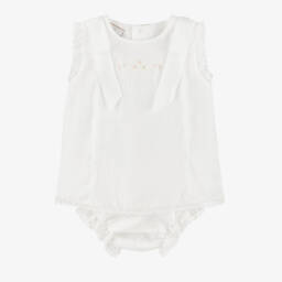 An adorable pink and white shorts set for baby girls by Spanish brand, Paz Rodríguez. Fastening with buttons on the back, the long-sleeved top is beautifully knitted in extra fine Merino wool with a diamond pattern and scalloped edging. It has an embroidered cotton frill on the neckline and a velvet bow and logo charm on the front. The traditional, floral-patterned shorts are made in soft cotton muslin and are lined for comfort. They have smocked and elasticated trims with a velvet bow to complete the look.