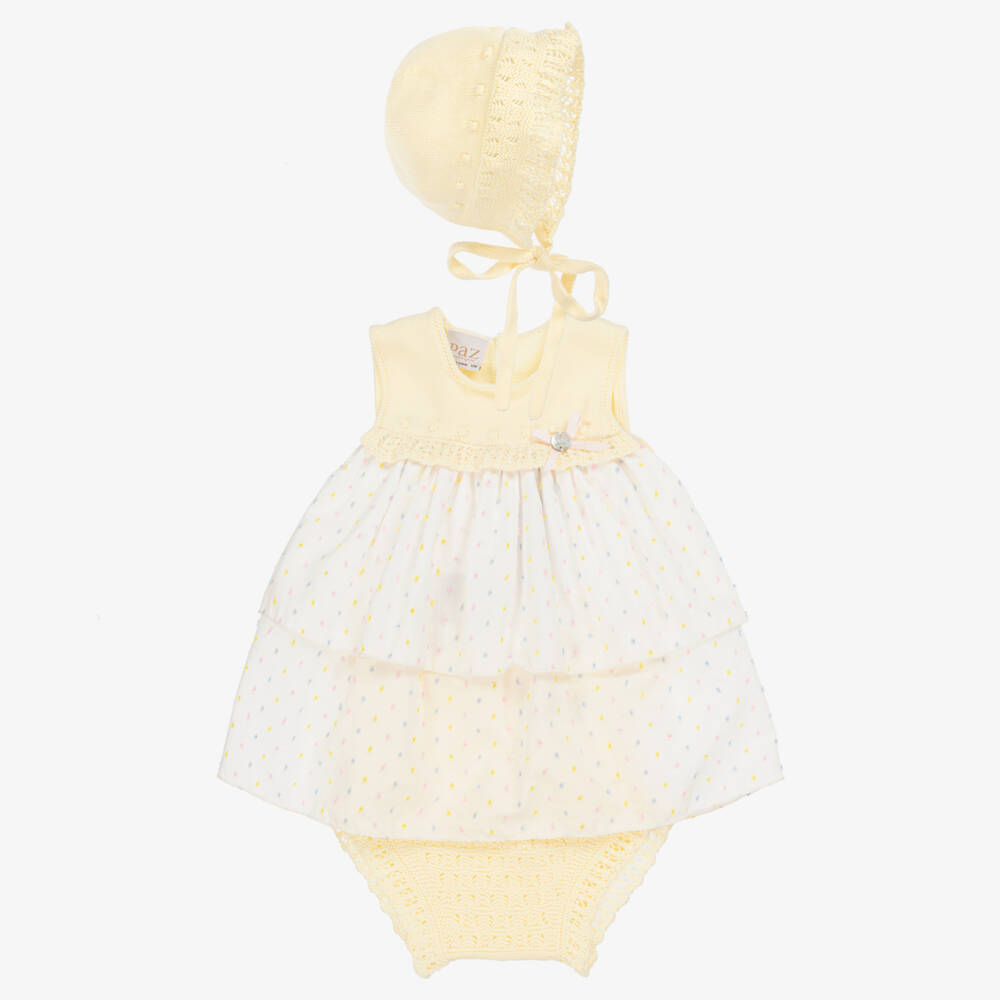 Lovley white and yellow dress set for baby girls by Spanish brand Paz Rodríguez. The dress is made in soft cotton trimmed with colourful plumetis. It has a knitted bodice with a lacy ruffle trim, pink bow and mother-of-pearl logo charm on the front. It fastens with buttons on the back. The dress comes with a pair of lacy knit bloomers. A knitted bonnet with ties to secure it under the chin, completes this pretty outfit.