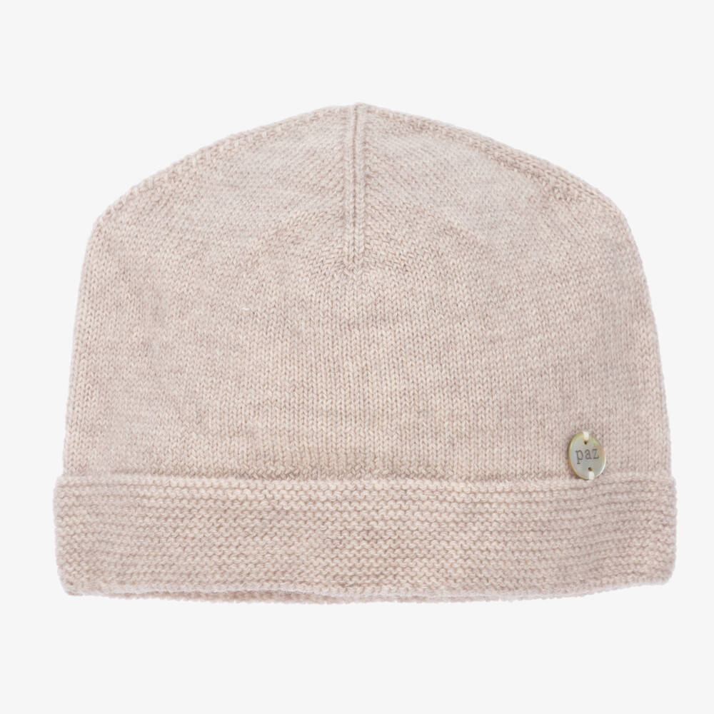 Adorable beige hat for baby boys and girls by Paz Rodriguez, with the brand's mother-of-pearl logo charm on the front.