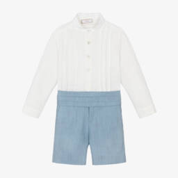 Navy blue and white shorts set for younger boys by Paz Rodríguez. Made in a soft viscose and linen blend, the short-sleeved shirt is styled with an open collar for a more relaxed look. The paired shorts come in soft stretch twill with useful pockets on the front and back. They have a button and zip fastening, and an adjustable waistband for when they grow.