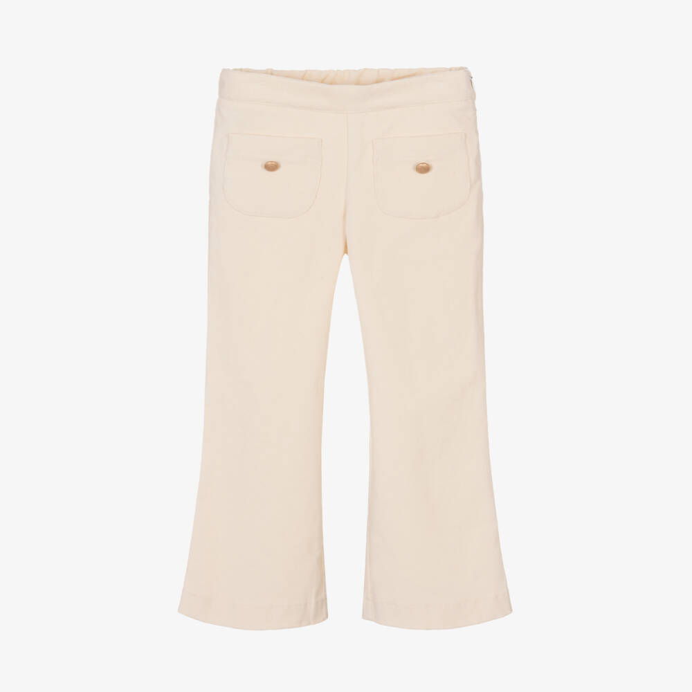 Charming ivory trousers for girls by Paz Rodriguez, made from beautifully soft cotton cord. There are patch pockets on the front, which are decorated with beige crest-effect buttons to create a classical look. They have a concealed zip fastening on the side for neat and effortless styling.