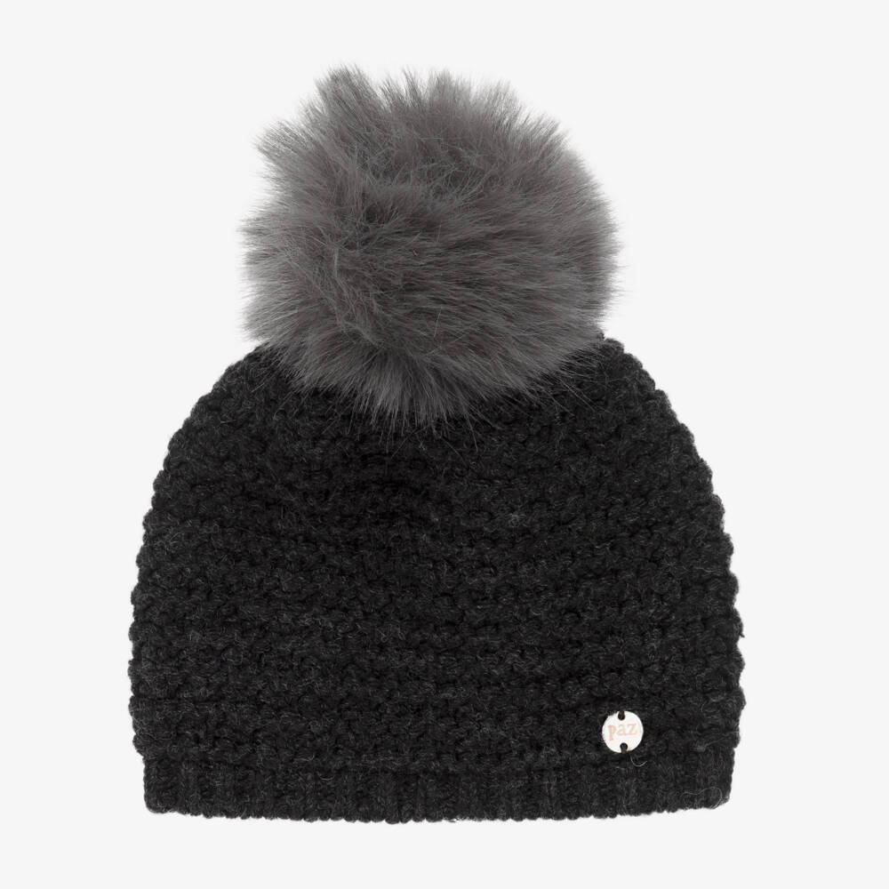 A knitted hat for little boys and girls from Paz Rodriguez, in charcoal grey. It is made in a soft merino wool blend, with a subtle silver-tone logo charm and a faux-fur pom-pom on the top.