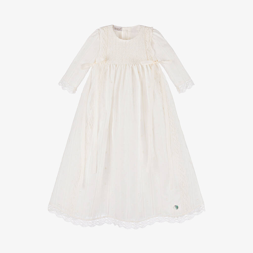 A traditionally-styled ivory ceremony gown for baby boys and girls by classic Spanish brand Paz Rodríguez. With a beautifully smocked bodice, it has delicate, beige lace trims and satin ribbon ties on the sides for just the right fit. It is made and lined in lightweight, striped cotton voile, with large, beige plumetis detailing and an iridescent, mother-of-pearl logo charm by the hemline. It fastens with matching, branded buttons on the back.