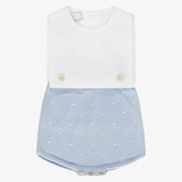 Cute shortie for baby boys and girls by PAZ Rodríguez, stylishly combining a white woven cotton bodice with a blue knitted bottom. It has sweet mother-of-pearl button detailing and fastens neatly on the back and between the legs.
