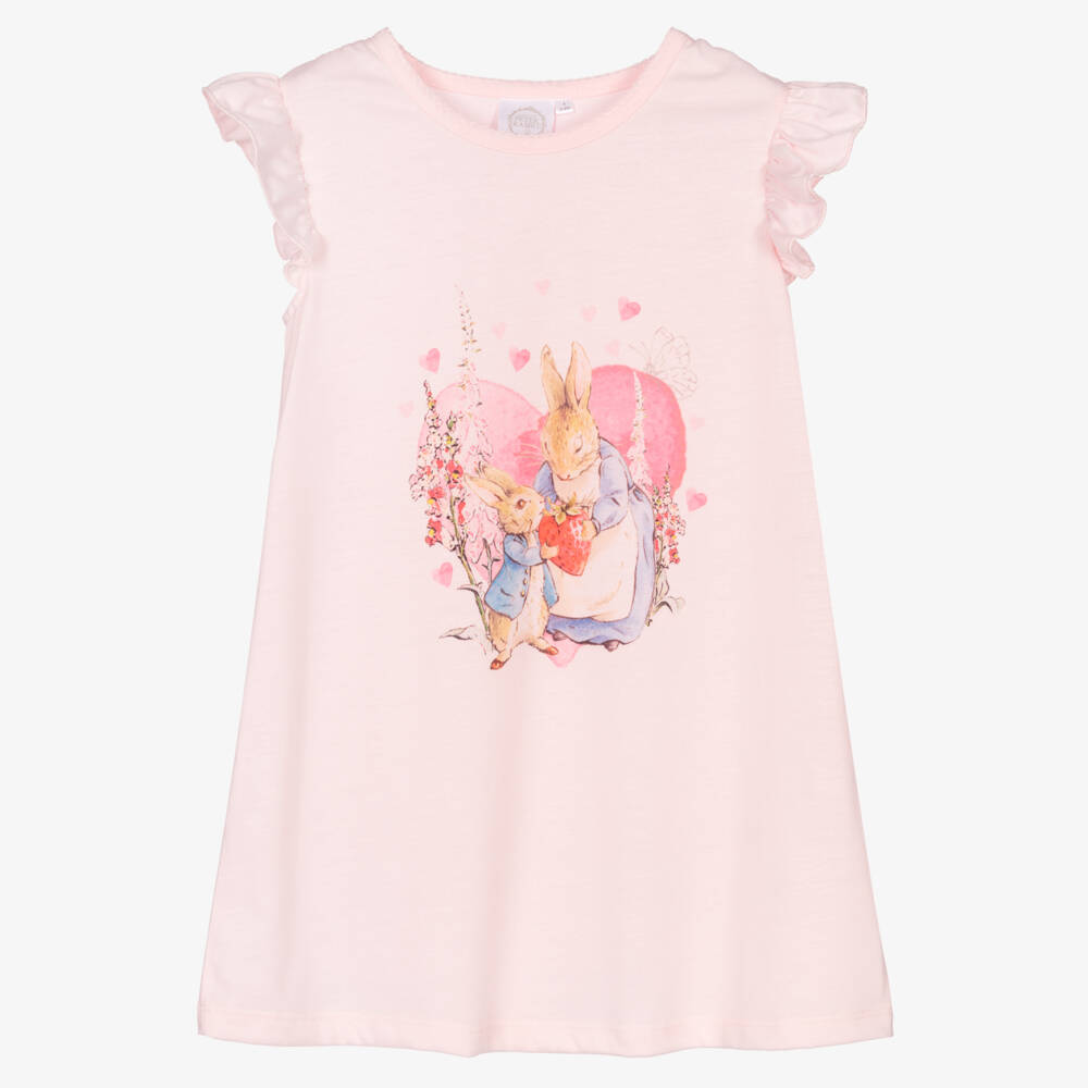 Pink jersey nightdress for girls from Peter Rabbit™ by Childrensalon. Super soft and lightweight, it has an adorable original Peter Rabbit illustration by Beatrix Potter on the front, with hearts and flowers in pink and blue. There are frills over the shoulders and pretty pink picot embroidery around the neckline.
