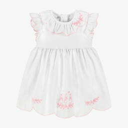 Adorable white and navy blue dressing gown for boys and girls from Peter Rabbit™ by Childrensalon, printed with charming original illustrations by Beatrix Potter. It is made in luxurious cotton twill, blended with flame-retardant fibres, free from harmful chemicals and brushed for extra softness. It has an attached sash belt and coordinating navy blue piped trims. As a lovely finishing touch, it is delicately embroidered with your child's name on the chest.