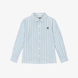 Smart, sage green and white striped shirt for baby boys by Petit Bateau. Made in soft and lightweight organic cotton poplin, it has a tonal, embroidered logo on the chest and button fastenings.