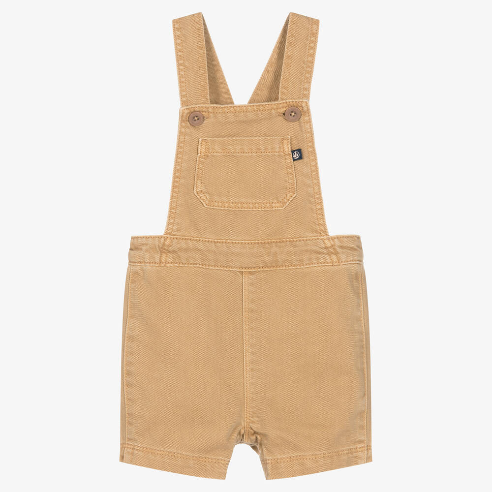 Beige denim dungaree shorts for little boys by Petit Bateau, with subtle faded detailing. The back of the waist is elasticated for comfort and the straps fasten with buttons on the bib front. There is a sweet little patch pocket, trimmed with a branded tab.