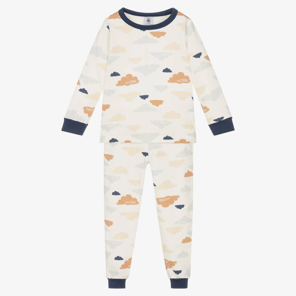 Super soft and cosy pyjamas for boys by Petit Bateau, in ivory with a cloud print in shades of beige, grey and blue. Made in mid-weight organic cotton jersey with a brushed feel inside, they have navy blue ribbed trims and a gently elasticated waistband for added comfort.