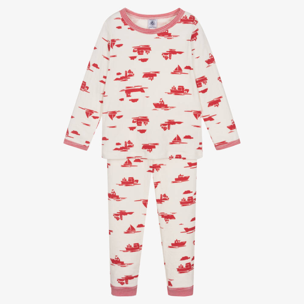 Cute ivory and red pyjamas for boys by Petit Bateau, made in soft organic cotton jersey. Both pieces are patterned with a lovely, all-over sailing print and have the brand's distinctive Milleraise striped trims. The long bottoms have an elasticated waist, promising comfort at bedtime.