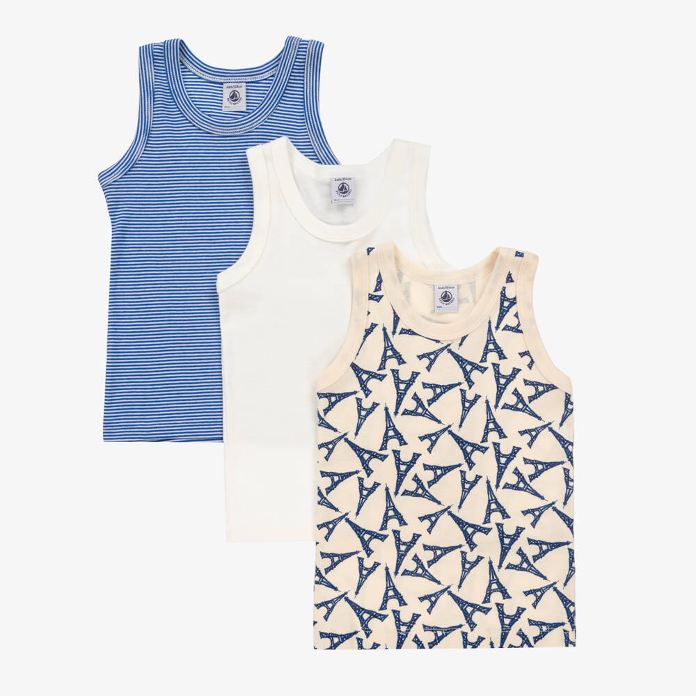 Pack of three vest tops for boys from Petit Bateau, in shades of ivory and blue. Made in soft organic cotton jersey, one is plain, one is patterned in the French brand's signature stripes and the other has a fun blue Eiffel Tower print.