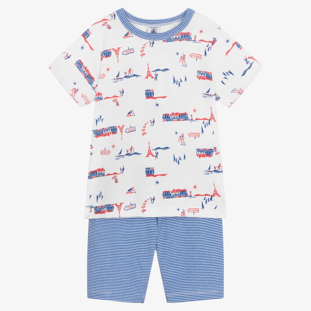 White and blue short pyjamas for boys by Petit Bateau, made in soft and stretchy organic cotton jersey. The white top has a fun red and blue French landmark and beach-themed design, with a blue and white milleraies striped trim around the neck. The shorts have a blue and white milleraies striped pattern and a comfortable elasticated waistband.