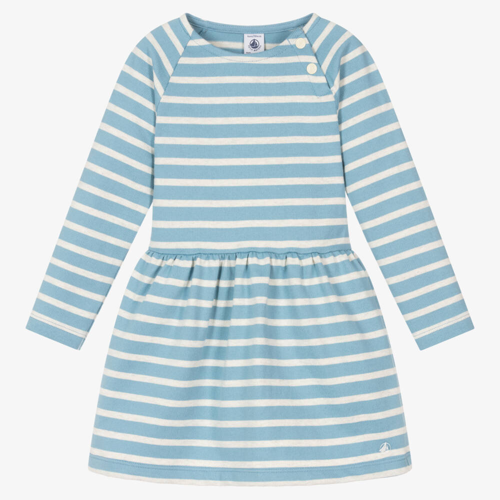 Pale blue and grey marl striped dress for girls by French brand Petit Bateau, made in comfortable organic cotton jersey. There are useful logo poppers on one shoulder for speedy dressing, and an embroidered white logo by the hemline of the full, gathered skirt.