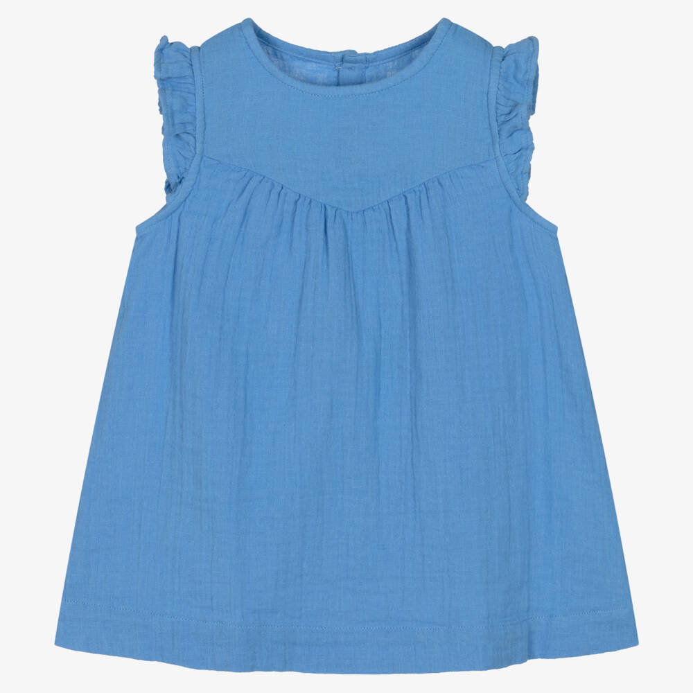 Mid-blue organic cotton dress for girls by classically-styled French brand Petit Bateau. Made in soft, slightly textured cheesecloth, it is beautifully lightweight and comfortable. It has pretty frills over the shoulders, gathers below the bodice and ivory button fastenings on the back.