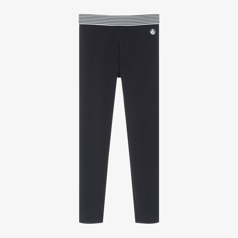 Navy blue leggings for girls by Petit Bateau, made in soft organic cotton jersey. The elasticated waistband is patterned in the brand's signature Milleraise stripes and they have the iconic white sailboat logo printed on one leg.