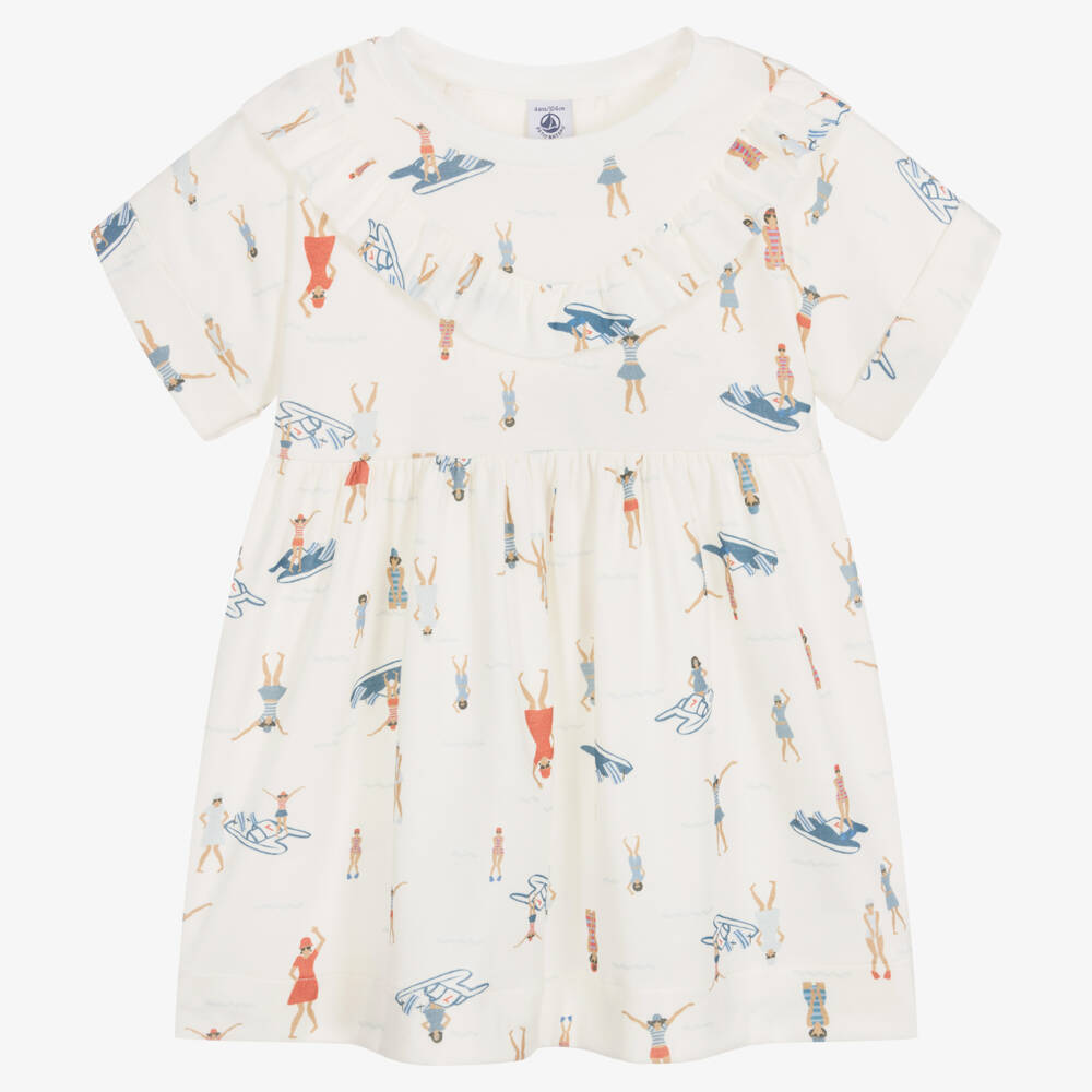 Ivory dress for girls by Petit Bateau, made in soft and comfortable organic cotton jersey. It has an all-over print of girls at the seaside and on pedalos in muted shades of blue and red. This loose-fitting, casual dress has a pretty ruffle trim on the front and stylish turn-ups on the short sleeves.