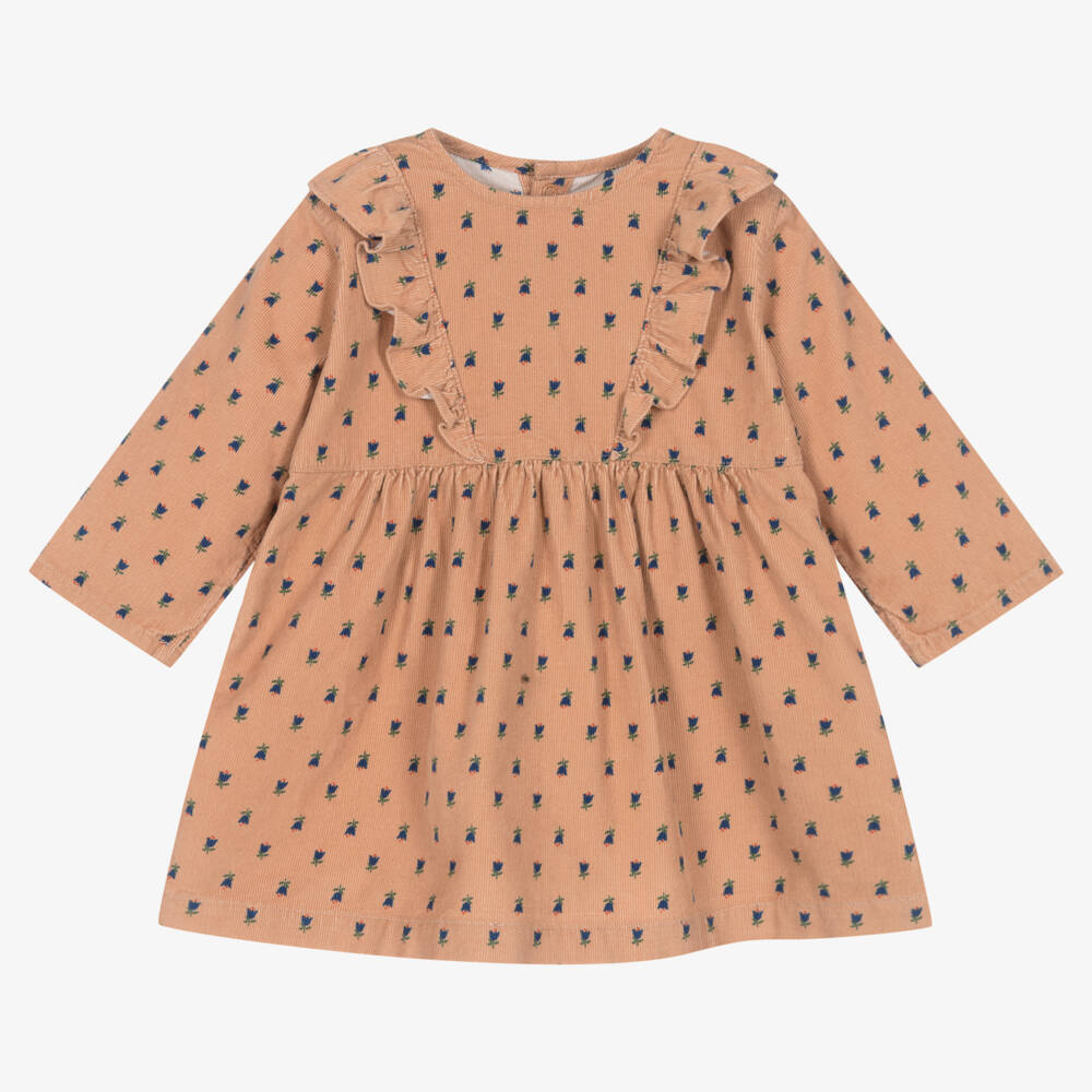 Terracotta pink dress for little girls by Petit Bateau, made in soft cotton needlecord. This pretty design is patterned with blue and green tulips and finished with slanted ruffle trims on the bodice. There are popper fastenings on the back of the neckline, making it easier to slip over the head.