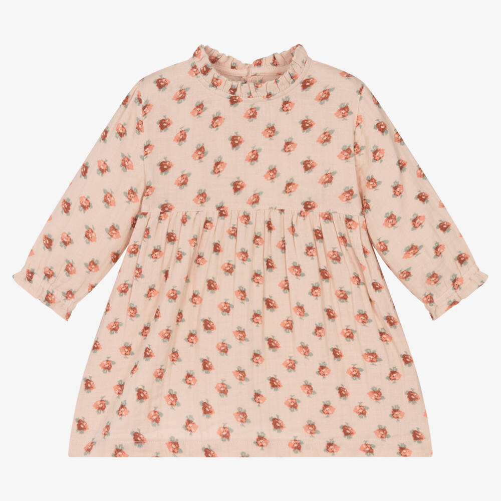 فستان أطفال بناتي قطن موسلين لون زهري بطبعة ورود
