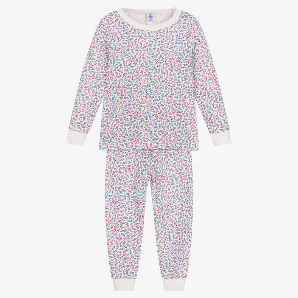 White long pyjamas for girls by Petit Bateau. Made in soft and comfortable organic cotton jersey, they have a pretty red and blue floral and leaf pattern and white cosy ribbed trims.