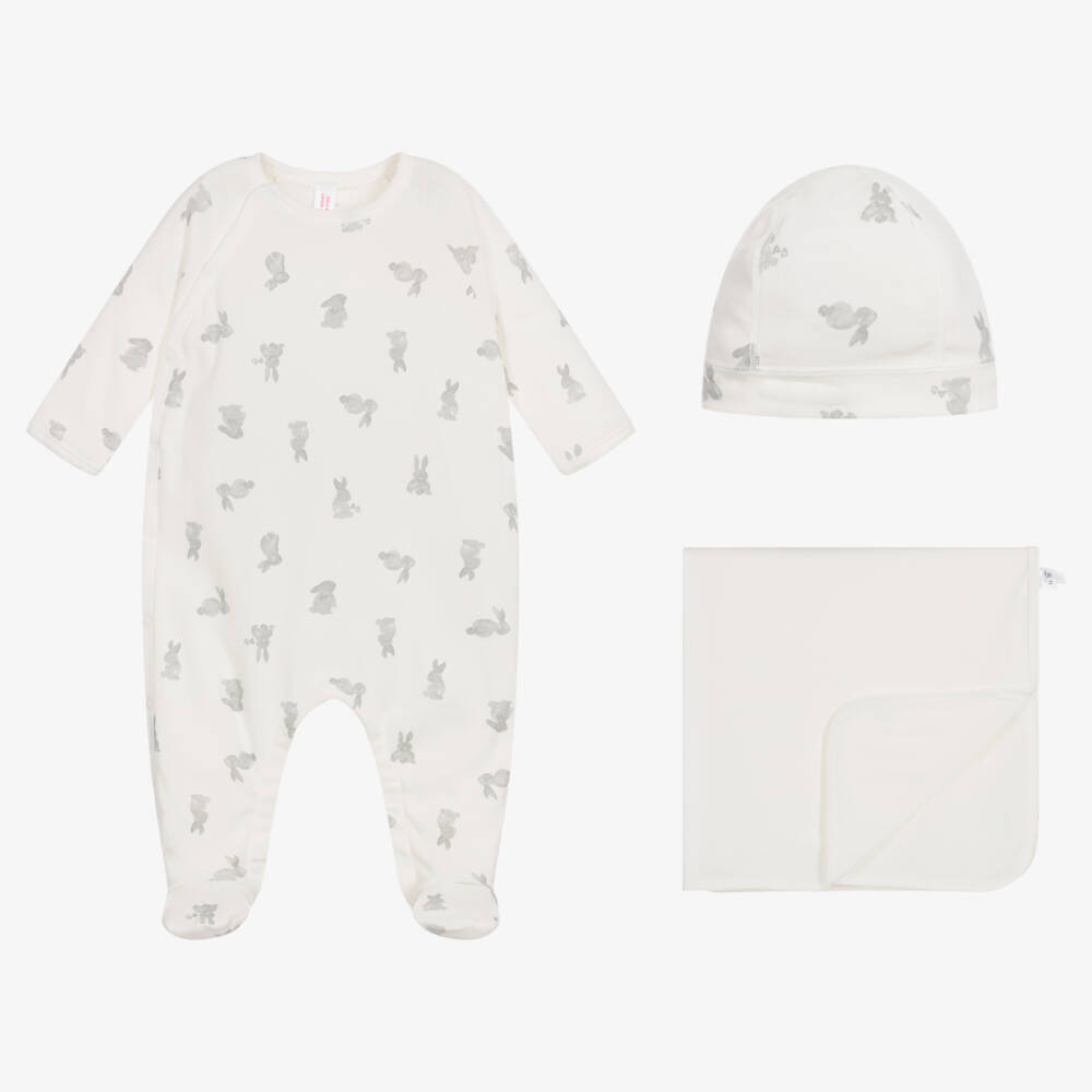 Ivory babysuit set for boys and girls by Petit Bateau, made in soft organic cotton jersey. This lovely three piece set comprises a babygrow, hat and blanket. The babygrow and hat have a cute grey rabbit pattern, whilst the single layer blanket is plain ivory. The babysuit fastens with poppers down the side and between the legs to help with dressing.