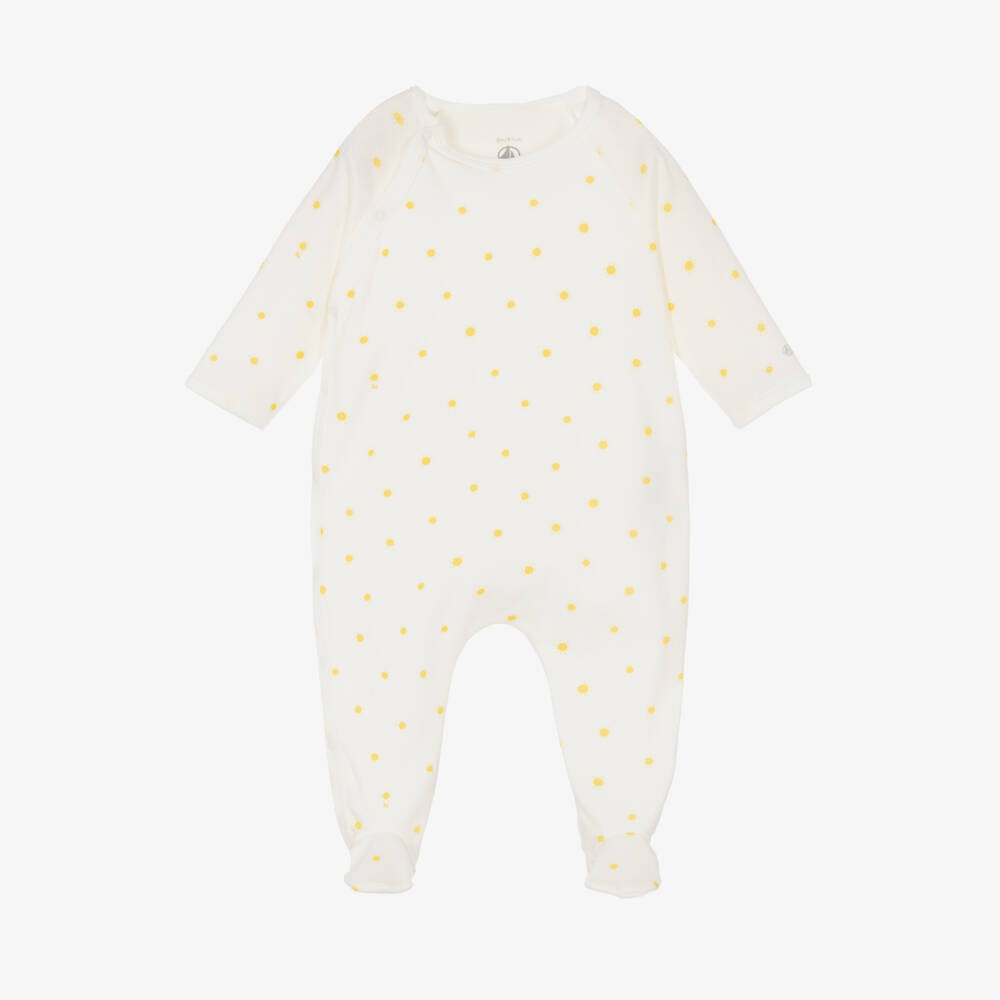 Ivory babygrow for boys and girls by Petit Bateau, made in organic cotton jersey for softness against the skin. With cosy enclosed feet, this sweet babysuit is printed with bright yellow suns for a cheerful feel. It has a discreet logo print on one sleeve and poppers on one side of the body to make dressing and changing easier.