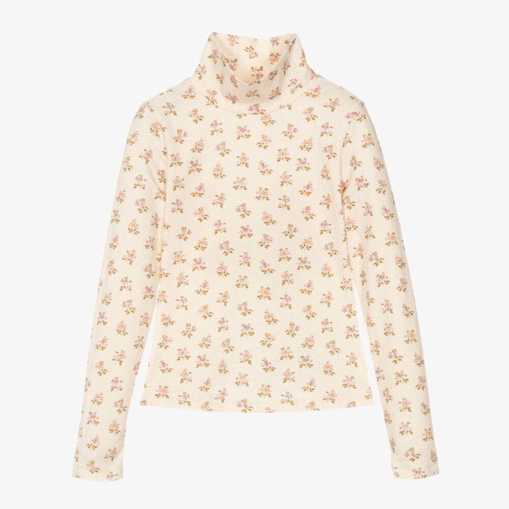 توب بياقة عالية وطبعة ورود قطن جيرسي لون عاجي
