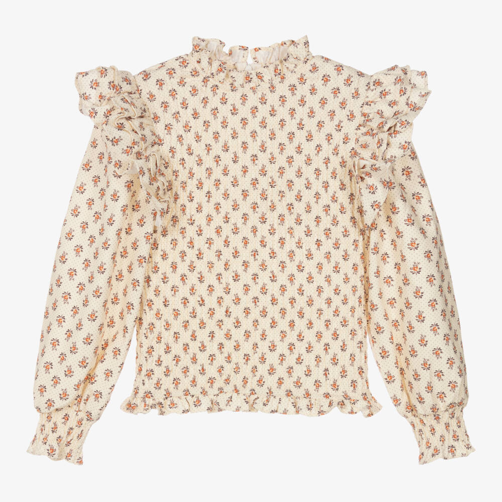 A lovely ivory blouse for older girls by Petite Amalie, made from soft and stretchy fabric. Patterned with beautiful orange and brown flowers, it has a stretchy, shirred bodice and layered ruffles on the shoulders. The long, puff sleeves are elasticated on the cuffs for a voluminous look. It has a high, ruffled neckline and a concealed zip fastening on the back.